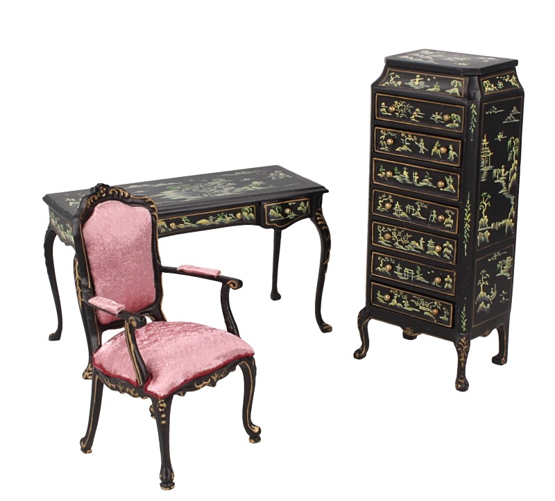 Conjunto de escritorio compuesto por mesa, silla y cajonera alta. La mesa y la cajonera tienen un acabado negro con detalles pintados en dorado y motivos decorativos. La silla presenta tapizado en tela rosa con estructura negra y detalles dorados, combinando elegancia y estilo clásico.